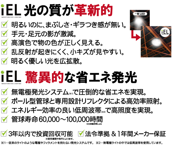 無電極ランプ「iEL照明(インダクションエコライト)」は長寿命、高演色、低出力による高照度を実現させた高品質の省エネ照明(無電極ランプ)です。工場、倉庫、商業施設、体育館、駐車場、街路灯などの照明交換・施工に伴う手間やランニングコストを大幅に削減します。影が出来にくく、まぶしさを抑えて目に優しく、高演色の明るい空間を創り出せるので作業環境の向上も期待できます。HIDランプや水銀灯に代わる省エネ・省資源時代の新エコ照明です。