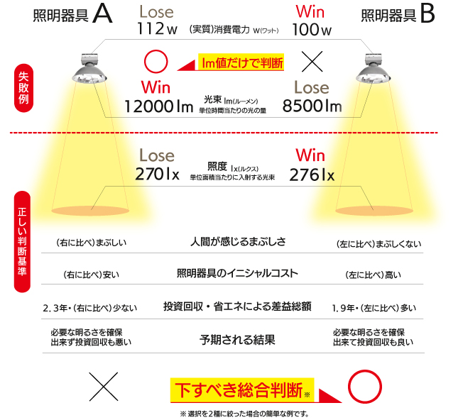 倉庫なのか、製造工場なのか、検品工場、鈑金工場なのか、ショッピングモールなのか、運動施設か、駐車場か・・・。設置場所や環境、目的によって「最適照明」は変わります。ご予算の問題もあります。それらを総合的に判断することで失敗を防ぐことが出来ます。後悔する大きな原因。