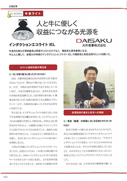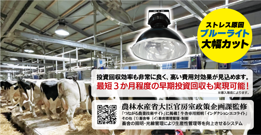 乳牛のストレス軽減に効果を発揮する“光の質“に特化した新型の省エネ照明。最小限の電力消費量で明るさを150〜200ルクスに保つ。光線管理を適切に行うことにより、搾乳量UPが可能。ブルーライトとグレア(眩しさ)がLEDと比較して大幅カット。従業員の「働きやすさ」にも好影響。