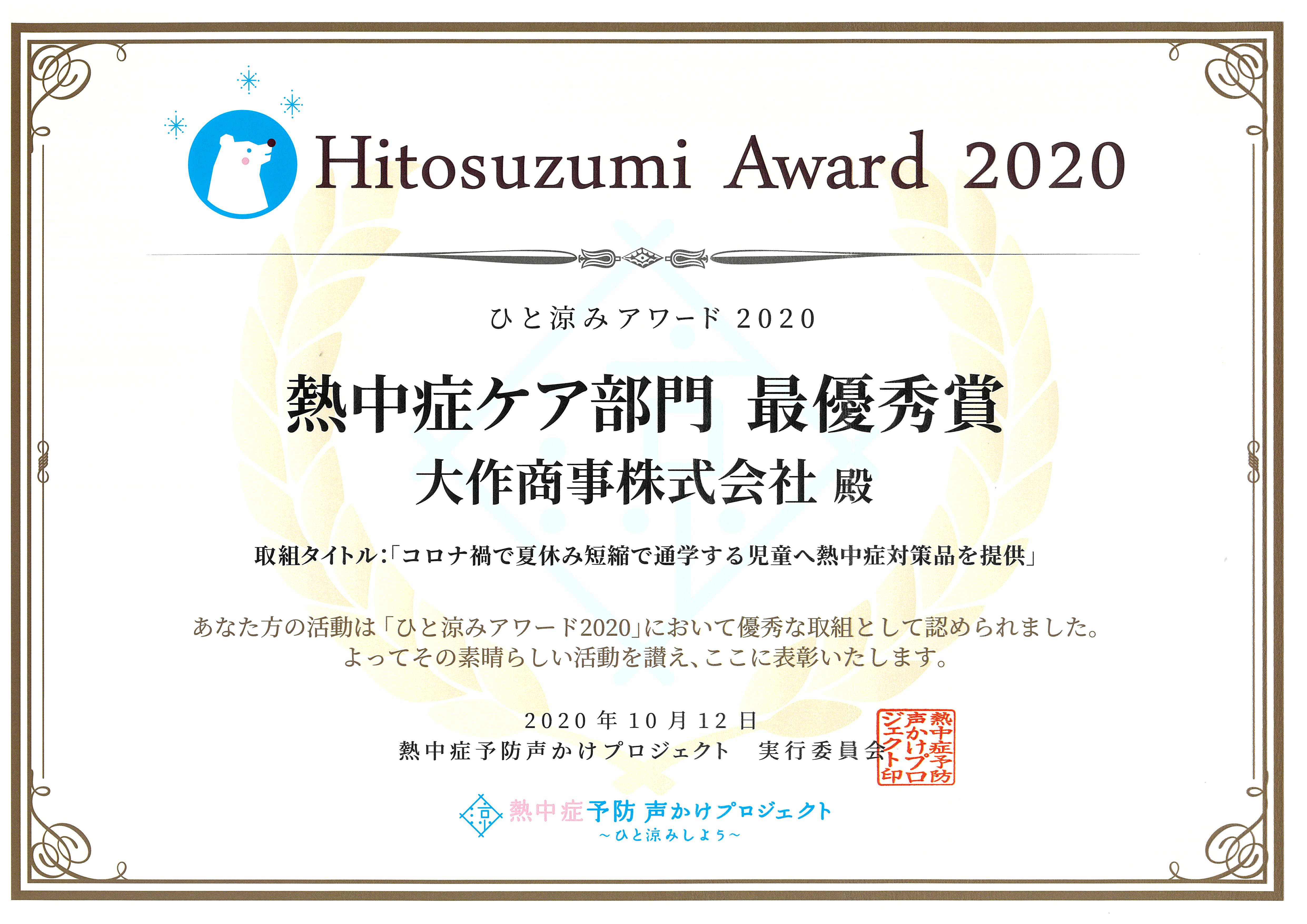 ひと涼みアワード2020熱中症ケア部門最優秀賞全国440件の取組の中から、熱中症ケア部門で今年も最優秀賞をいただきました。