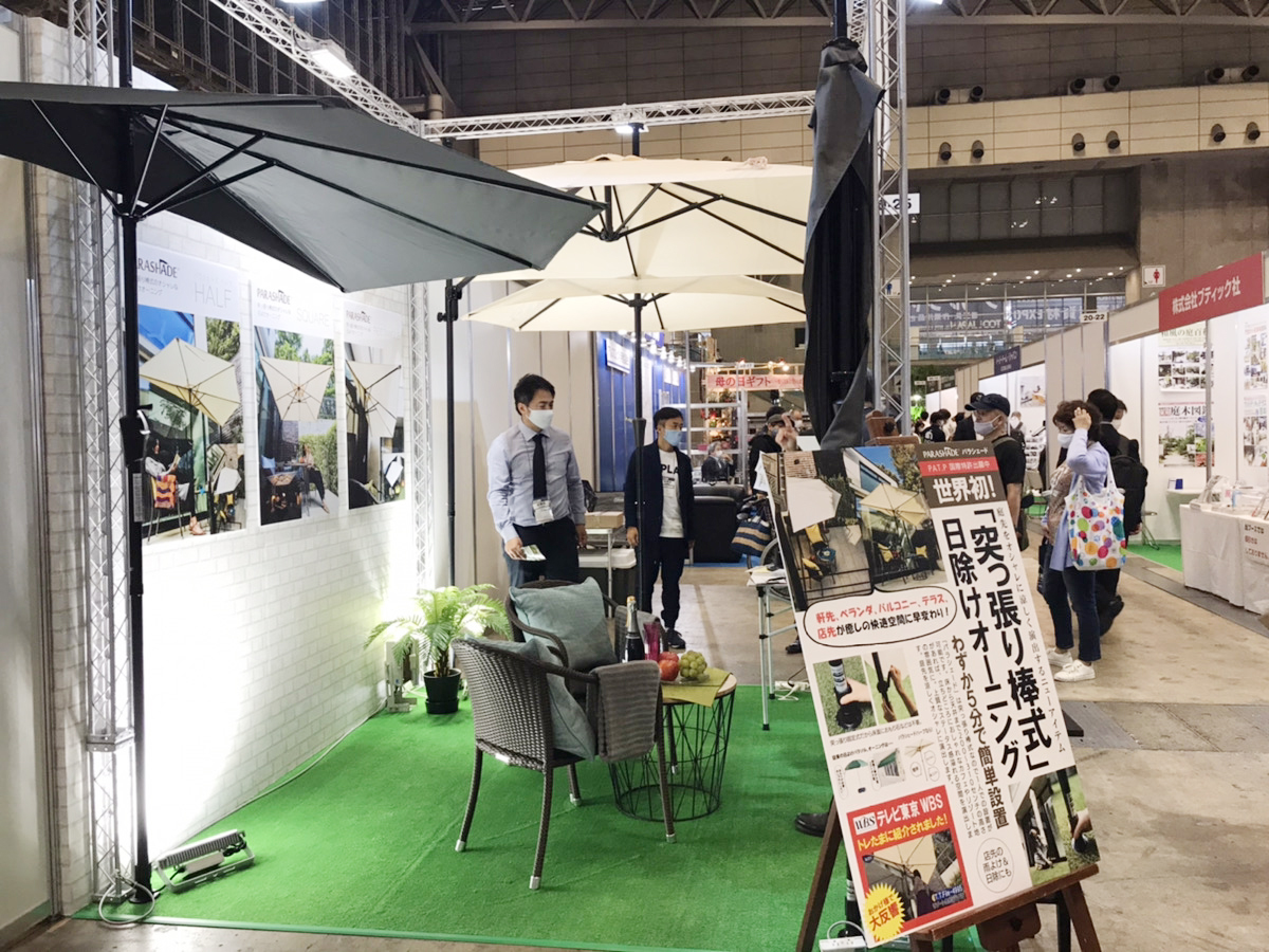 第14回国際ガーデンEXPO出展2020年 10月14日(水)〜16日(金)に開催された第14回国際ガーデンEXPO出展にて突っ張り棒式日よけオーニング「パラシェード」を展示し、ご好評いただきました。ブースに足をお運びいただきました皆様に厚く御礼申し上げます。