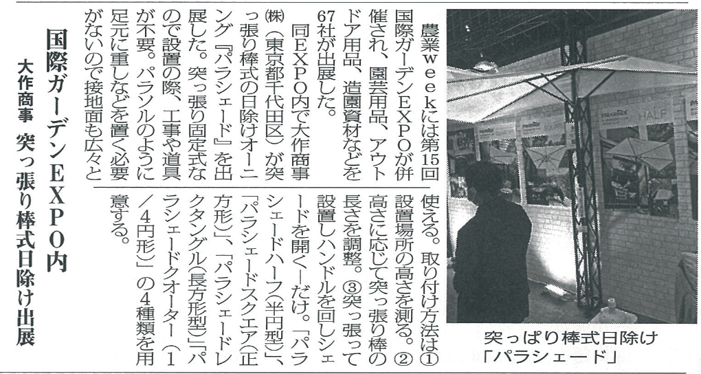 第1543号 産繊新聞掲載第1543号 産繊新聞にて第15回国際ガーデンエキスポ(2021年10月13日~10月15日開催)の様子と展開アイテム「パラシェード」を掲載いただきました。是非ご覧ください。