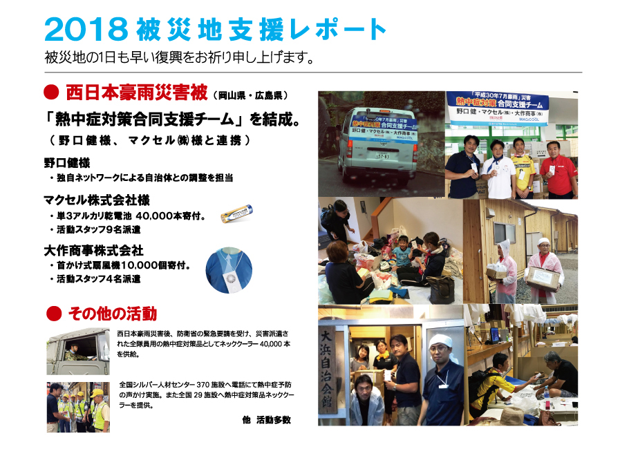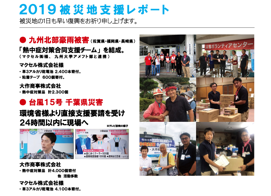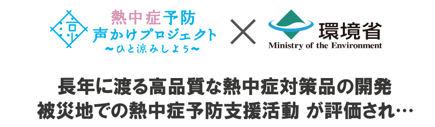 当社の千葉県台風災害支援を始め数々の被災地熱中症予防支援活動、並びにこれまでの優れた熱中症対策品の開発普及事業が環境省より評価され環境大臣賞を受賞しました。 (熱中症対策支援)マジクールネッククーラー、マイファンモバイル、クイッククール(ミスト付きファン)を支援させて頂きました。 被災地の一日も早い復旧・復興をお祈り申し上げます。