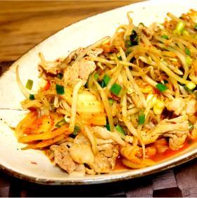| 油不要 炒めない 豚キムチ炒め エネルギー:175kcl、塩分:2.5g |