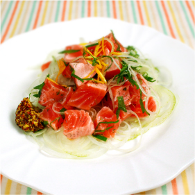| 浸透圧で時短調理 サーモンマリネ エネルギー:219kcl、塩分:1.2g |