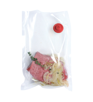 - クリッカをセットした袋に炒めた玉ねぎとにんにく、牛肉、タイムを入れ、クリップで袋の口を閉じ、ポンプで袋内を真空にします。