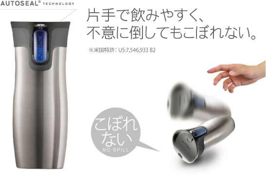 「フタを開ける」「飲む」「フタを閉める」この一連の動作が片手で完了する真空断熱マグ「Autoseal(オートシール)マグ」。開閉は指1本で完了。片手でサッと飲んで、置いたときにはフタは閉まっています。フタの閉め忘れが無いので、万一倒してしまったときもこぼれることがありません。指をスイッチから離したらすぐに閉まるので、寝かして置いても大丈夫。フタの閉め忘れが無く、不意に倒してもこぼれません。オートシールマグは様々なシーンで特別なメリットをもたらします。