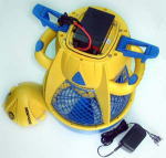 ドルフィン頭部のレバーを開くとカバーがはずれ、バッテリーが取り出せます。ドルフィンのバッテリーは密閉式。液もれがありませんのでお部屋の中でもだいじょうぶ。本体に入れたままでも、バッテリーだけでもOK。ご家庭のコンセントにつなぐだけで充電できます。