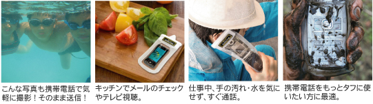 モバイルパックは、レジャーだけではなく、雨の日の現場作業や、キッチンなど手が汚れる仕事中にも活躍。そのまま手に取りすぐに通話、メール、撮影が可能です。わざわざ手を洗って電話をかけ直すなどのわずらわしい手間も省ける画期的なモバイルツール。