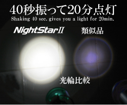 ナイトスターUは、40秒振るだけで約20分も点灯し(※)、電池・電球不要で衝撃にも強く、水深300M防水(水に浮きます)、錆びることもありません。そのシステムはアメリカで数々の特許を取得しています。
