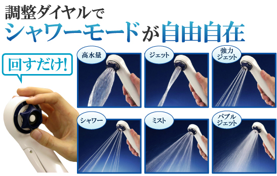 ダイヤルを回すことで、打たせ湯のようなジェットモードから、細かい霧状のミストモードまで調節可能! ダイヤル調整で徐々に変化する仕組みなので、バリエーションは豊かに調整できます。お好みのシャワーモードでお楽しみください。