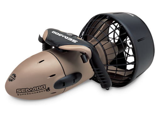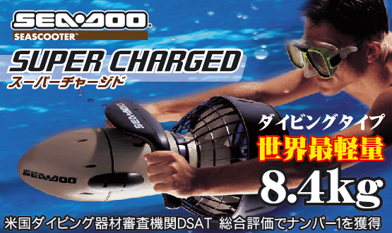 世界No.1のジェットスキーメーカー「SEADOO(シードゥー)社」が自社ブランド名で開発した世界最軽量8.4kgのシースクーター「VS SUPERCHARGED」。アメリカのダイビング器材審査機関DSAT(ダイビングサイエンス&テクノロジー)で安全・品質・性能の総合評価でナンバー1を獲得した究極のシースクーターです。 操作性、パワーに優れた軽量、高性能設計。2段階のスピードコントロール付きで、MAXスピード約4.8km/h、最大水深30mまで潜行可能。フィンワークをサポートして空気消費量を押さえ、より長く、楽しいダイビングを低価格でお楽しみいただけます。 一流アウトドア雑誌「BE−PAL(ビーパル)」やTV局のニュース番組等で取材されるなど、マスコミ関係で話題沸騰の実力・人気とともに高レベルの「SUPERCHARGED」は、この夏大注目です!スーパーチャージドの特徴