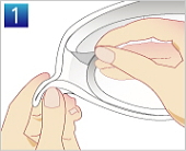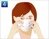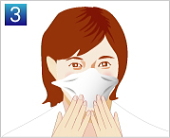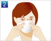 | マスク端のシールつまみ部分からシールをはがして下さい。 | マスク上部を鼻上部の好みの位置に貼り付け、約15秒しっかりと押し付けて装着して下さい。 | 少し口をあけた状態で(マスク装着後しゃべれるように)マスクの下部をあごの下にセットし貼りつけ、約15秒しっかりと押し付け装着して下さい。 | ||
