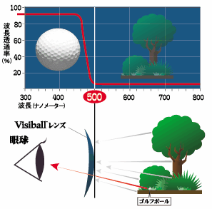 ビジボールの特殊レンズは物体が発する光の波長を選別し500ナノメーター以上の波長(芝生や植物の緑・黄色・オレンジ色)を90%カット。